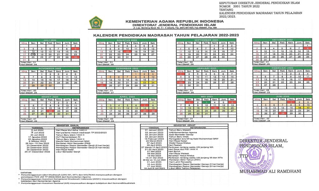 Kaldik RA dan Madrasah tahun pelajaran 2022/2023 ini ditetapkan melalui Keputusan Direktorat Jenderal Pendidikan Islam Nomor 3001 Tahun 2022 Tentang Kalender Pendidikan Madrasah Tahun Pelajaran 2022/2023. Regulasi yang ditandatangani langsung oleh Dirjen Pendis, Muhammad Ali Ramdhani ini ditetapkan 3 Juni 2022.