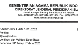 Dengan hormat kami sampaikan, bahwa dalam rangka meningkatkan ketepatan sasaran penerima bantuan sosial Program Indonesia Pintar (PIP) Madrasah Tahun Anggaran 2023 diperlukan Pemutakhiran Data Siswa Penerima PIP. Basis data penerima Bantuan Program Indonesia Pintar (PIP) Tahap I Tahun 2023 adalah siswa penerima bantuan PIP Tahun 2022 sehingga perlu dilakukan verifikasi dan validasi sebelum ditetapbkan kembali sebagai penerima bantuan sosial PIP Tahun 2023.