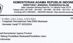 Dengan hormat disampaikan, Direktorat Jenderal Pendidikan Islam Kementerian Agama RI akan melaksanakan kegiatan pemutakhiran data EMIS Madrasah Semester Ganjil Tahun Pelajaran 2023/2024. Sehubungan dengan hal tersebut, kami informasikan beberapa hal sebagai berikut: