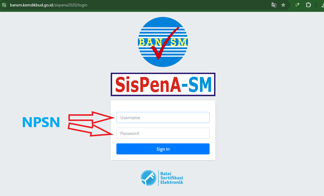 2. Silahkan masukkan username dan sandi menggunakan NPSN